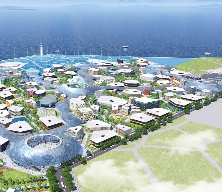個分ほどの広大な敷地に、パビリオンが立ち並ぶパビリオンワールド、宿泊施設などが中心となるウォーターワールド、緑地帯グリーンワールドが整備される予定です。来場者数は約2800