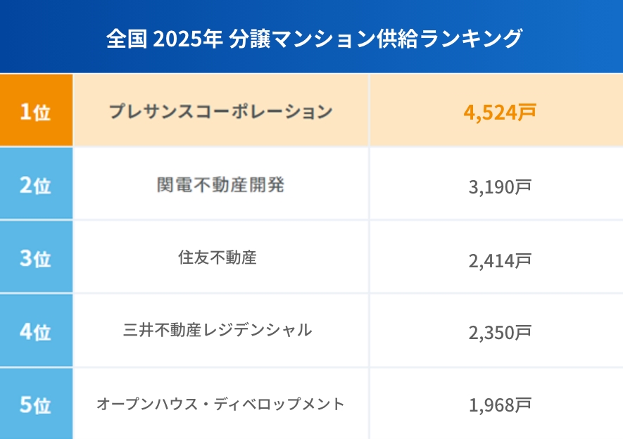 プレサンスNEXTは2025年の分譲マンションの供給戸数ランキングにおいて、並み居る大手を抑えて全国1位を獲得したプレサンスの100%子会社であるため、安定した経営が見込めます。